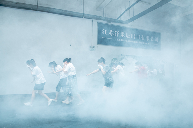 企業(yè)員工在搜救人員的指揮帶領下,彎著腰,貓著步,捂住口鼻,沿著指定路線有序撤離到一樓的安全地帶。