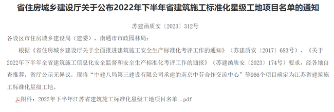 近期,省建設(shè)廳下發(fā) 《 關(guān)于公布2022年下半年江蘇省建筑施工標(biāo)準(zhǔn)化星級(jí)工地公示名單 》的通知,城發(fā)公司投資建設(shè)的青年公寓一期土建及安裝工程喜獲“江蘇省建筑施工標(biāo)準(zhǔn)化星級(jí)工地”(二星)稱號(hào)。該榮譽(yù)的獲得是公司扎實(shí)推進(jìn)省安全生產(chǎn)標(biāo)準(zhǔn)化建設(shè),落實(shí)上級(jí)關(guān)于推進(jìn)安全生產(chǎn)標(biāo)準(zhǔn)化建設(shè)工作部署的要求,建立健全管理機(jī)制,積極開(kāi)展安全文明標(biāo)準(zhǔn)化工地創(chuàng)建所取得的成果,為全省樣板化示范,有效提升建筑施工水平,安全生產(chǎn)發(fā)揮了引領(lǐng)作用。