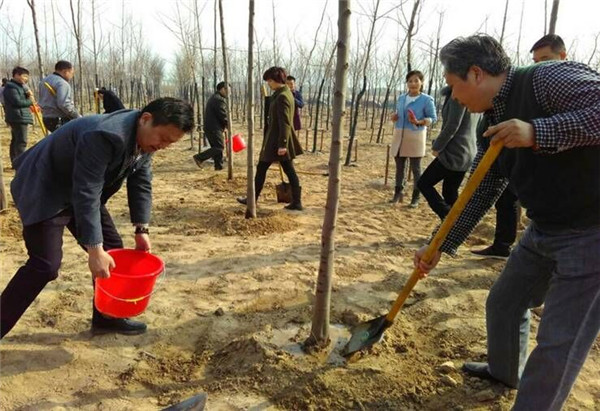 植樹過程中,參加植樹的人員個個熱情高漲、干勁十足,他們幾個人一組,扶直樹苗、揮鍬培土、踩實壓緊,不時還向身邊的園林綠化技術(shù)指導(dǎo)人員討教樹木種植、養(yǎng)護知識,整個勞動場面繁忙而有序。